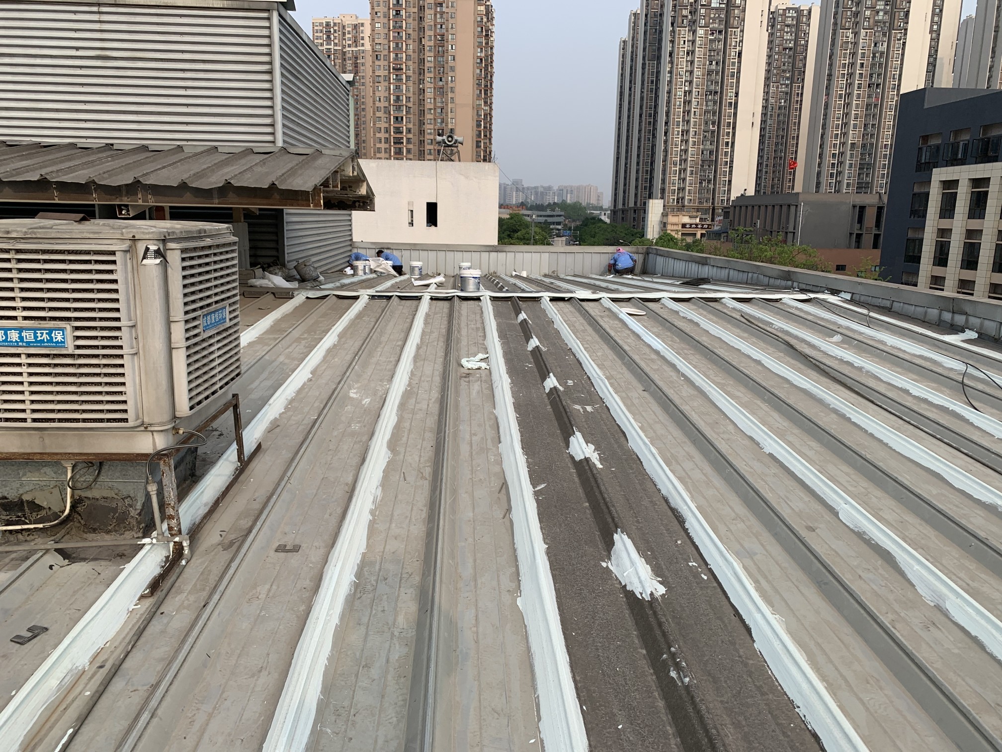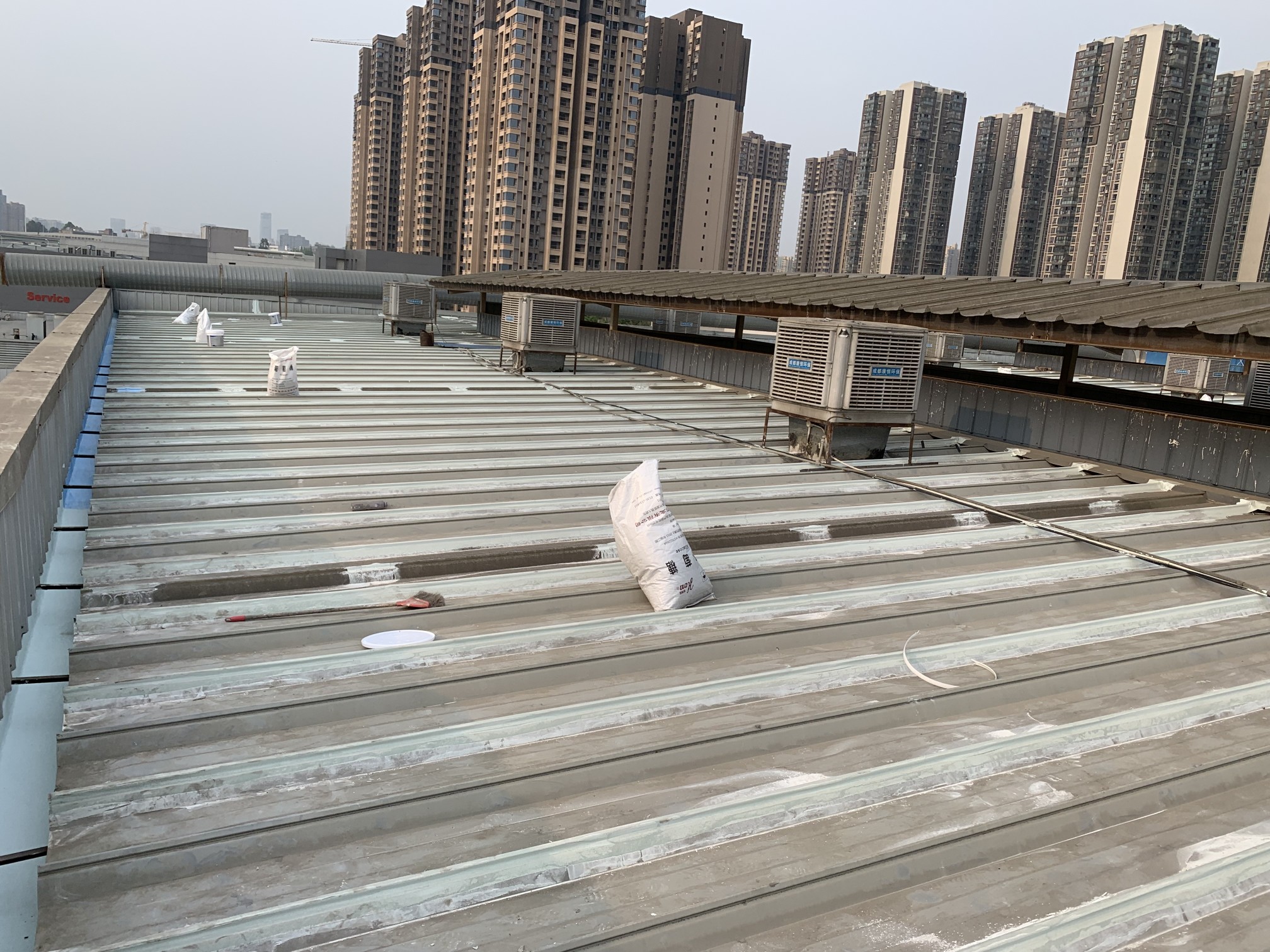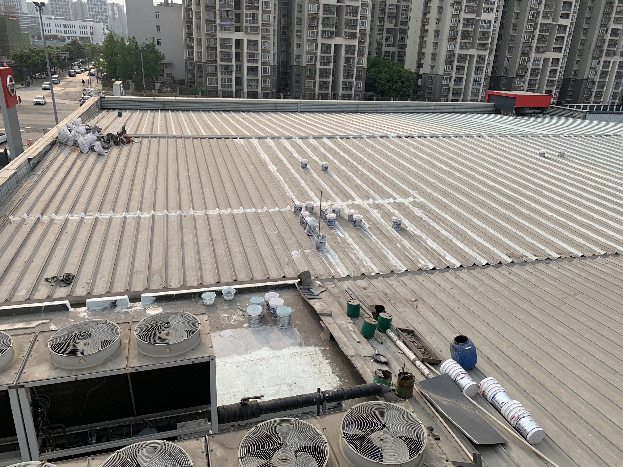 成都市錦江區(qū)皇經(jīng)樓路297號的啟陽汽車錦江園區(qū)日產(chǎn)汽車4S店彩鋼頂屋面防水工程,彩鋼頂屋面以及排水溝采用蜀禹SYR金屬屋面專用防水涂料配合防水專用縫織聚酯布進(jìn)行施工,施工后可管十年以上不漏水。施工時(shí)先將排水溝內(nèi)的淤泥清理出來裝袋,然后再涂刷防水涂膜,施工后再將屋面清理的垃圾搬運(yùn)下樓青云出場。