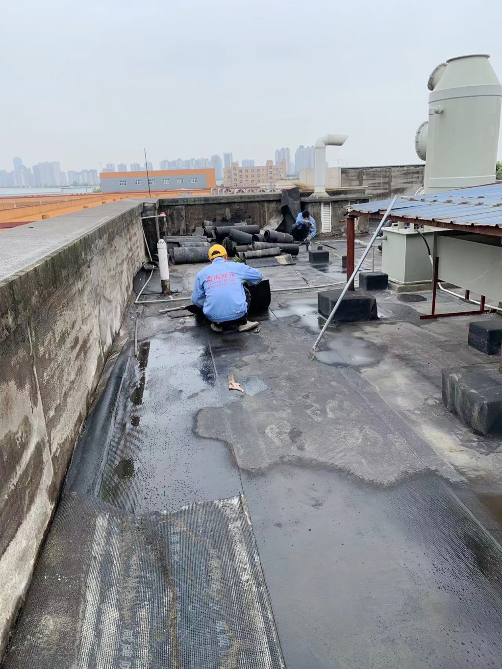 面對這一挑戰,我們采用了先進的SYR外露型無縫防水系統。在項目開始之初,我們注意到原屋頂表面覆蓋的是已經老化開裂的改性瀝青防水卷材。為了確保防水效果的長久性和可靠性,我們決定先將這些老舊的防水卷材徹底清除,并對基層表面進行細致清理,確保每一寸都干凈整潔,為后續的防水工作打下堅實基礎。