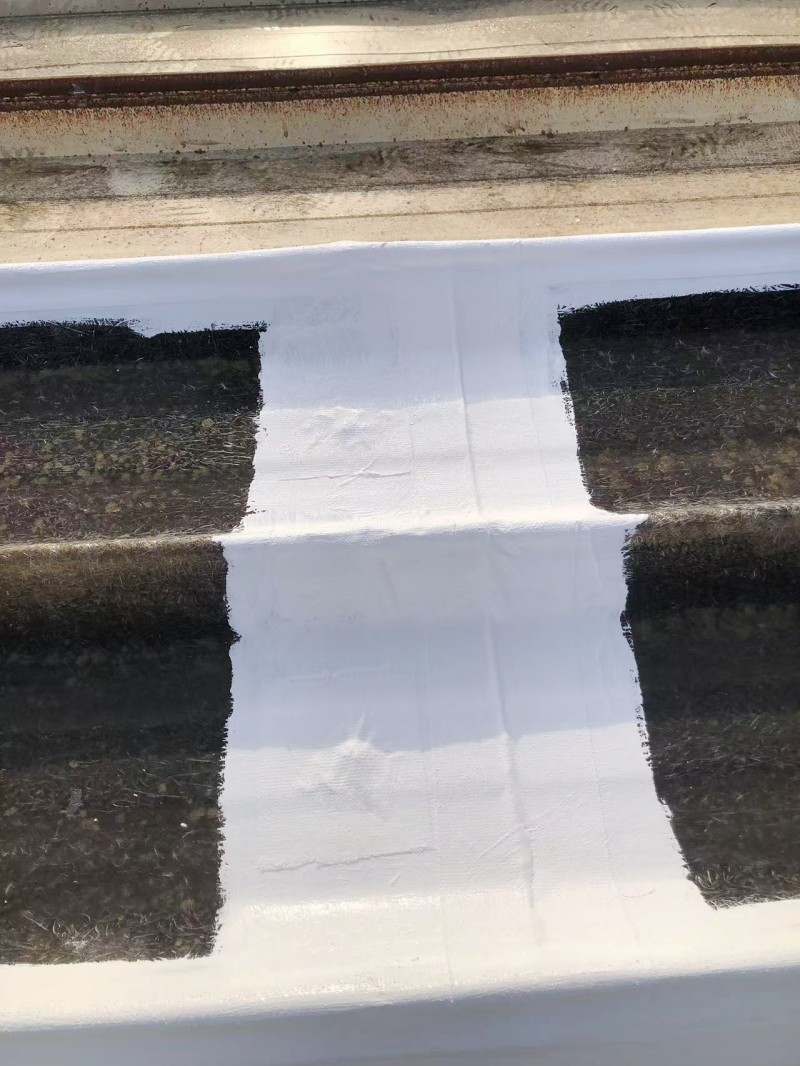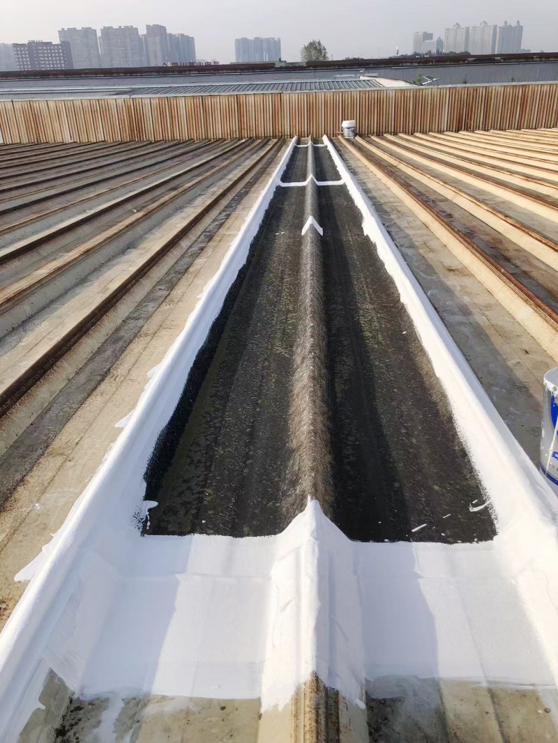 對于天溝這一重點防水區域,蜀禹防水公司更是進行了特別的關注。他們清理干凈基層并涂刷了納米固銹劑之后,針對下水口位置重點處理,然后不僅在天溝內滿涂刷了SYR金屬屋面防水涂料,還滿鋪貼了專用縫織聚酯布。這種組合方式不僅能夠有效防止水分滲透,還能夠增強天溝的強度和耐久性,防止其因銹蝕而脫層。