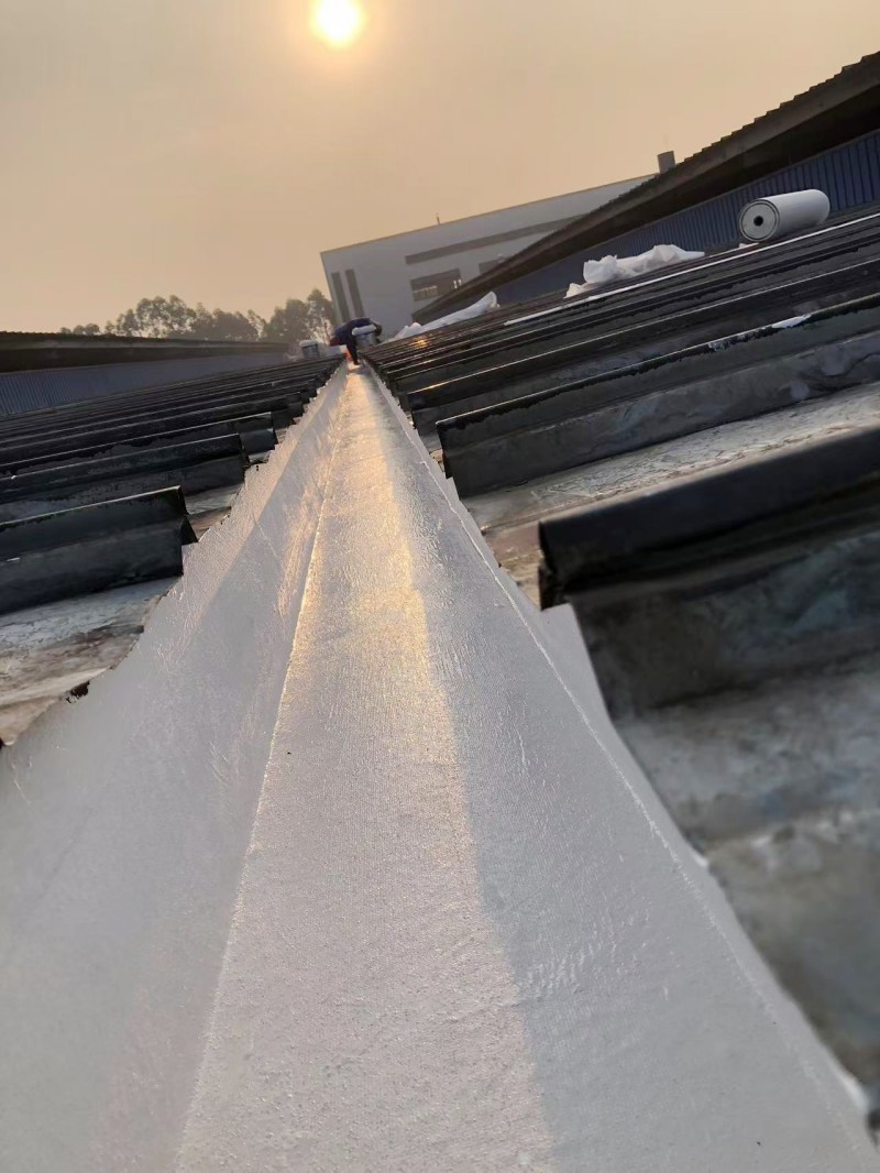 多層防水施工:在天溝內底部及兩側面滿涂刷一遍 SYR 金屬屋面專用防水涂料后,滿鋪貼專用縫織聚酯布(100g/㎡),然后在聚酯布表面滿涂刷 SYR 金屬屋面專用防水涂料。待干透之后第二天,再在天溝內底部及兩側面滿涂刷第三遍 SYR 金屬屋面專用防水涂料,通過多層防水施工,確保天溝區域的防水防腐效果。