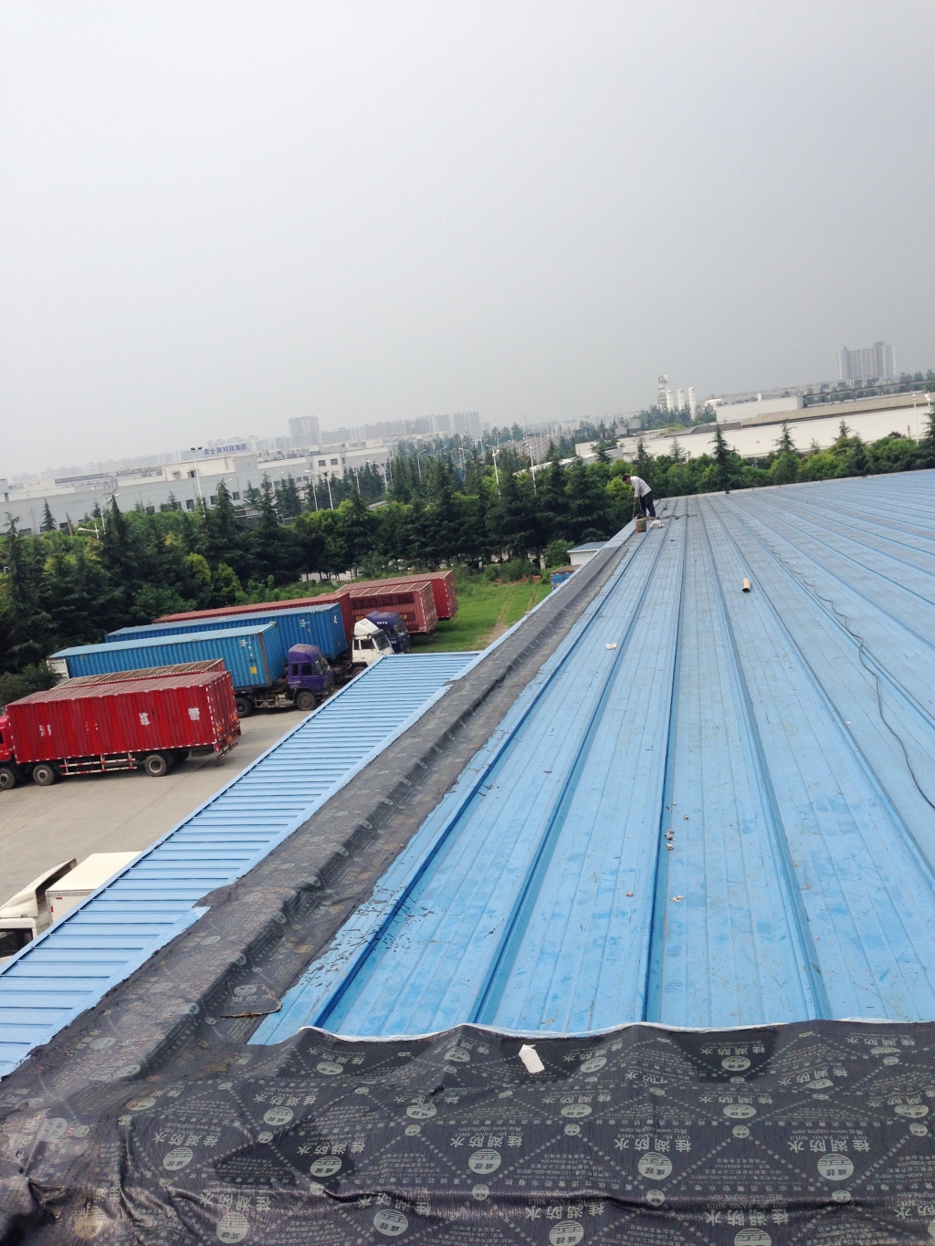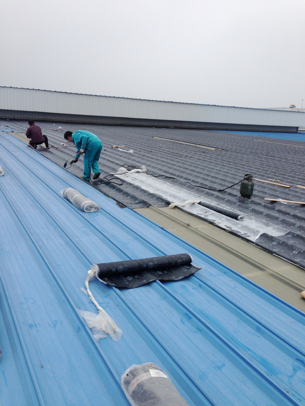 根據以前多處工地情況,使用改性瀝青防水卷材局部粘貼彩鋼瓦連接縫,由于彩鋼瓦表面熱脹冷縮伸縮性較大,改性瀝青防水卷材多數會被拉裂,而且改性瀝青卷材粘貼太窄,邊沿也會有部份翹邊。所以我們現在對于彩鋼瓦漏水情況采取的方案是:將漏水的位置對應一直到脊梁的彩鋼瓦表面全部滿鋪一層改性瀝青防水卷材,由于表面均為改性瀝青防水卷材,底下彩鋼瓦張合均不影響表面防水卷材。