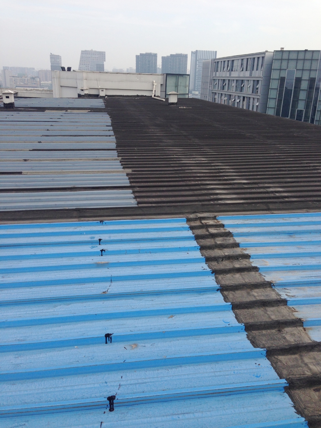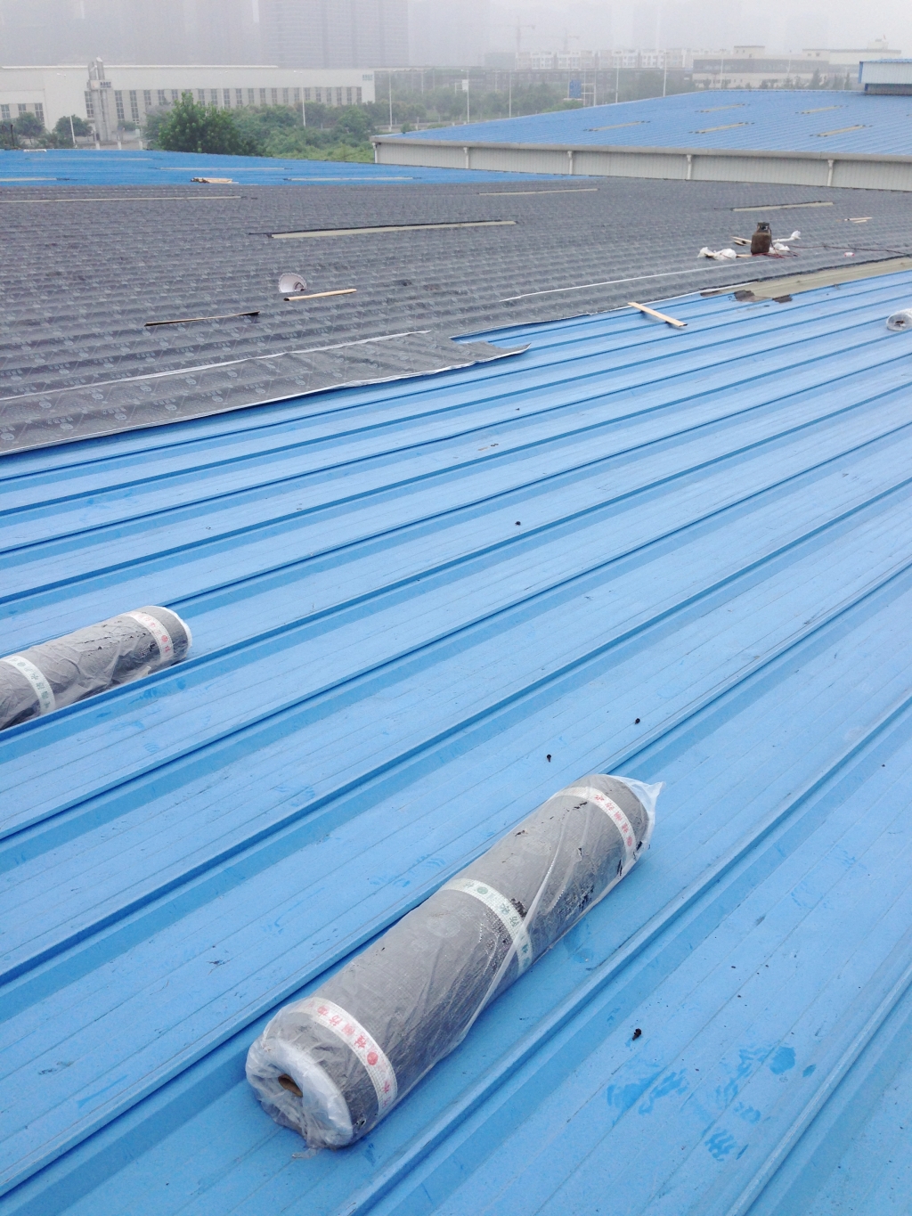 彩鋼瓦屋頂經過幾年的風吹雨打,表面油漆容易掉落,油漆掉落后表面很快就會出現銹跡斑斑,個別地方彩鋼瓦就會銹穿孔,導致漏水,滿鋪一層改性瀝青防水卷材,不但能夠起到防水作用,而且保護了彩鋼瓦,使彩鋼瓦的使用壽命延長,所以此工程我們采用漏水區域頂全全做一層SBS改性瀝青防水卷材的方法。