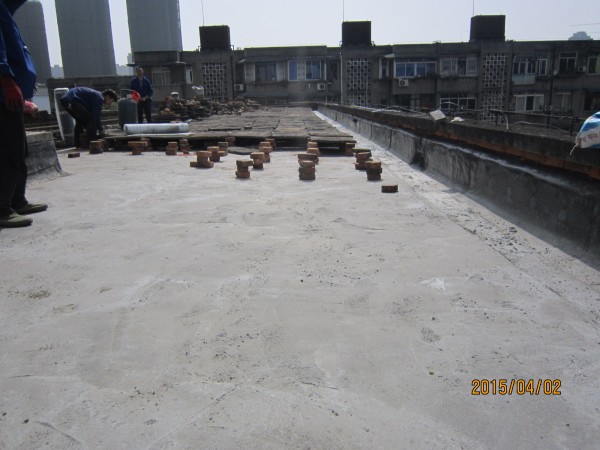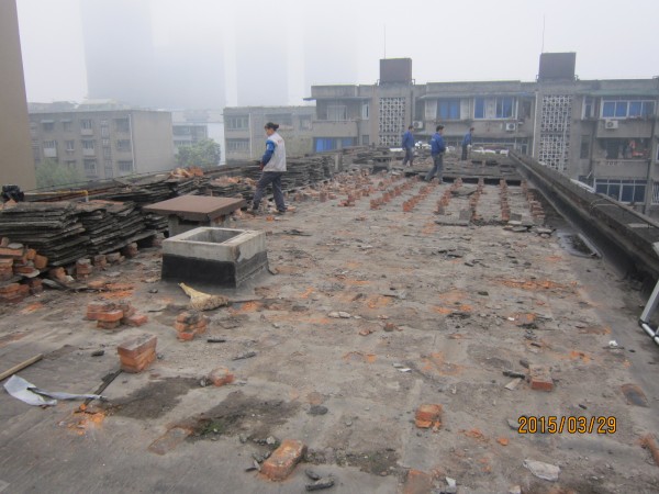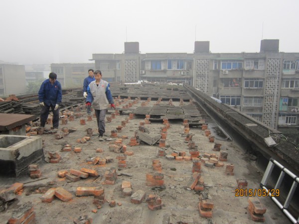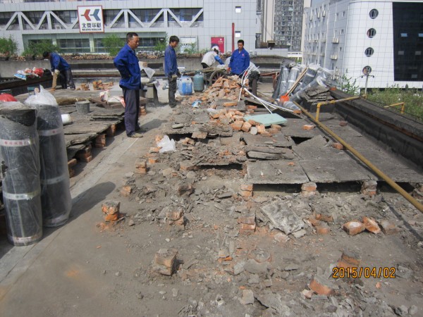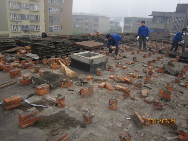 中節能建設工程設計院有限公司在成都市經華北路一號院和經華北路10號的宿舍小區老舊房屋由于年代久遠,房屋多處漏水,公司針對小區所有屋頂進行了一次全部的防水施工,將屋頂有隔熱板的區域屋頂,隔熱板揭開,基層清理干凈,滿鋪一層改性瀝青防水卷材,再做一層水泥砂漿保護層,最后再蓋回隔熱板。1號樓屋頂無隔熱板的,在屋頂表面鋪一層改性瀝青防水卷材。